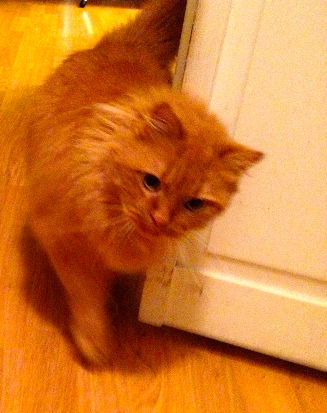 as her cats rub against her and purr,