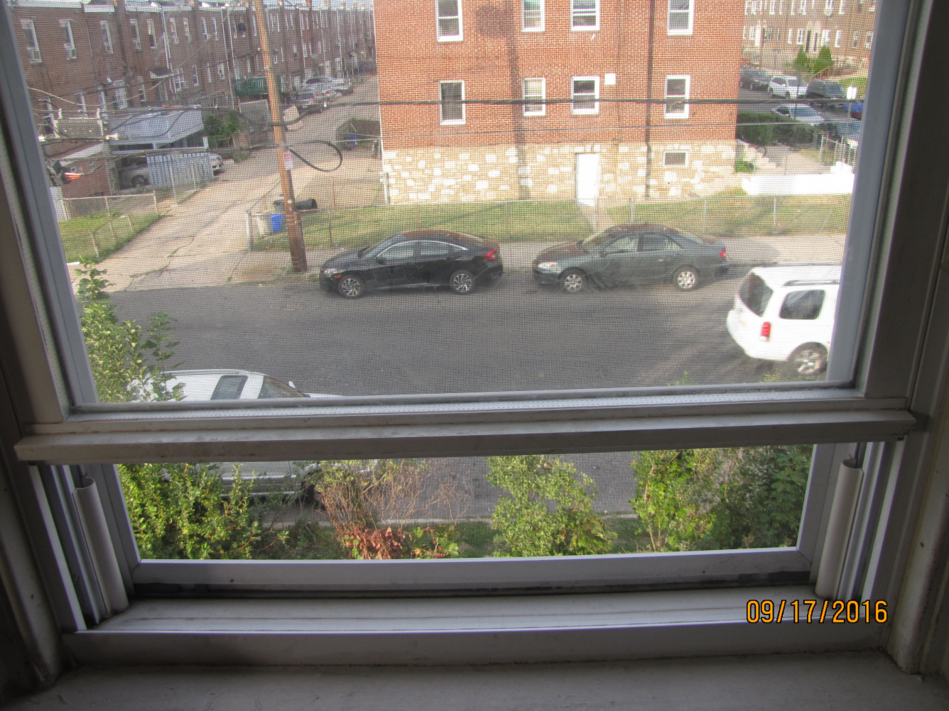 I see brick row houses lined up evenly on a street, squished together, one street after another. A sea of row homes joined with brick and mortar.