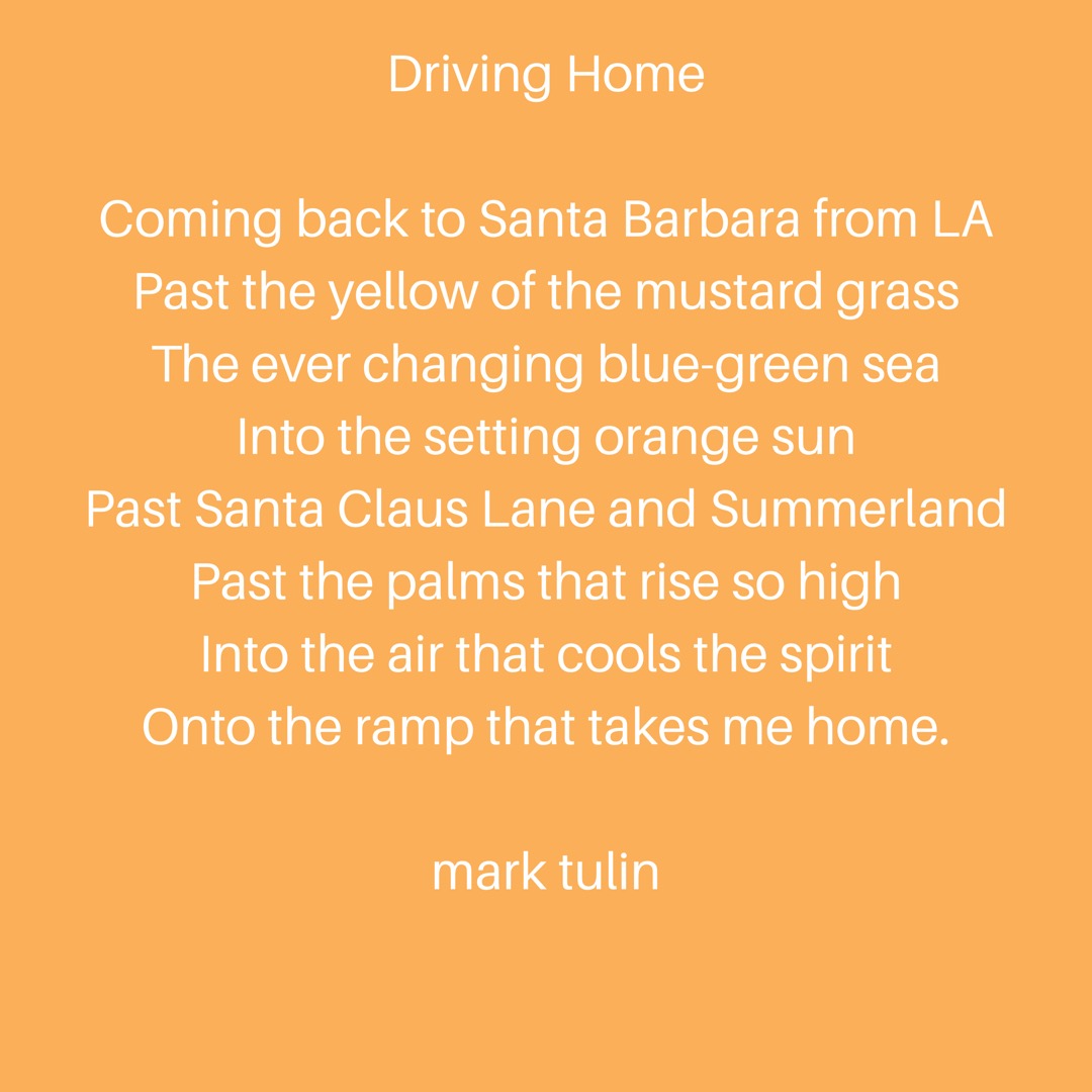 Poetry Poem: Driving Home by Mark Tulin by Mark TulinMay 13, 2017 Comments 2 Share this: Click to share on Facebook (Opens in new window) Facebook Click to share on LinkedIn (Opens in new window) LinkedIn Click to share on Pocket (Opens in new window) Pocket More Click to share on X (Opens in new window) X Click to share on Pinterest (Opens in new window) Pinterest Click to share on Reddit (Opens in new window) Reddit Click to share on Tumblr (Opens in new window) Tumblr Like Loading... 2 comments on “Poem: Driving Home by Mark Tulin” Irene May 14, 2017 Beautiful!! Reply Mark Tulin May 14, 2017 Thanks Irene. Reply Leave a comment Cancel reply Δ Post navigation Previous Post Next Post