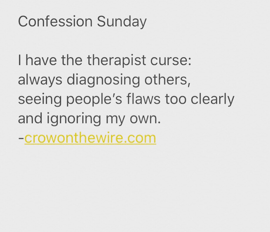 Confession Sunday Confession Sunday: Therapist Curse by Mark Tulin by Mark TulinDecember 24, 2017 Comments 3 Share this: Click to share on Facebook (Opens in new window) Facebook Click to share on LinkedIn (Opens in new window) LinkedIn Click to share on Pocket (Opens in new window) Pocket More Click to share on X (Opens in new window) X Click to share on Pinterest (Opens in new window) Pinterest Click to share on Reddit (Opens in new window) Reddit Click to share on Tumblr (Opens in new window) Tumblr Like Loading... 3 comments on “Confession Sunday: Therapist Curse by Mark Tulin” Hope December 25, 2017 You should keep this photo around so that when you feel that way, you can say “what’s wrong with this picture?” Then step back and say The words are up to you! Have a great day! Smile! Yes keep smiling and the world will wonder what you are up to! Reply boompawolf January 22, 2018 I think we all have a little bit of a therapist’s clarity on other people. Reply Mark Tulin January 22, 2018 Yes we do. While we wear blinders to our own faults. Reply Leave a comment Cancel reply Δ Post navigation Previous Post Next Post