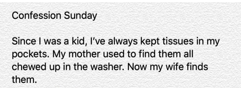 Confession Sunday Confession Sunday: Dirty Habit by Mark Tulin by Mark TulinMarch 25, 2018 Comments 14 Share this: Click to share on Facebook (Opens in new window) Facebook Click to share on LinkedIn (Opens in new window) LinkedIn Click to share on Pocket (Opens in new window) Pocket More Click to share on X (Opens in new window) X Click to share on Pinterest (Opens in new window) Pinterest Click to share on Reddit (Opens in new window) Reddit Click to share on Tumblr (Opens in new window) Tumblr Like Loading... 14 comments on “Confession Sunday: Dirty Habit by Mark Tulin” The Mush from the Hill March 25, 2018 You’re not alone there Fella LOL Reply Mark Tulin March 25, 2018 😊 Reply pvcann March 25, 2018 I hate the fleck of white on my jeans Reply Mark Tulin March 25, 2018 yes, it sticks on everything. 🤧 Reply pvcann March 25, 2018 🙂 lovesdeepwaters March 26, 2018 My dad did that. A real downside to doing his laundry. Reply Mark Tulin March 26, 2018 For sure. 🙂 Reply Hope March 27, 2018 All of a sudden in the dryer I hear cling, clang, cling. Open the dryer door and wow change from my son’s pockets. WOW! .50 cent tip what more could I ask for. Maybe paper money so it won’t scratch the dryer. 💲💲💲💲 Reply Mark Tulin March 27, 2018 Nice tip, but I’m sure you deserve more. 😊 Reply Hope March 28, 2018 Thank you I will let me son know.😊 Iriowen March 30, 2018 LOL 😂 Reply -Eugenia April 9, 2018 Been there, done that myself.:) Thank you for following BrewNSpew. Reply Mark Tulin April 9, 2018 😊 Reply Anna Cottage April 18, 2018 Lovely story. Reply Leave a comment Cancel reply Δ Post navigation Previous Post Next Post