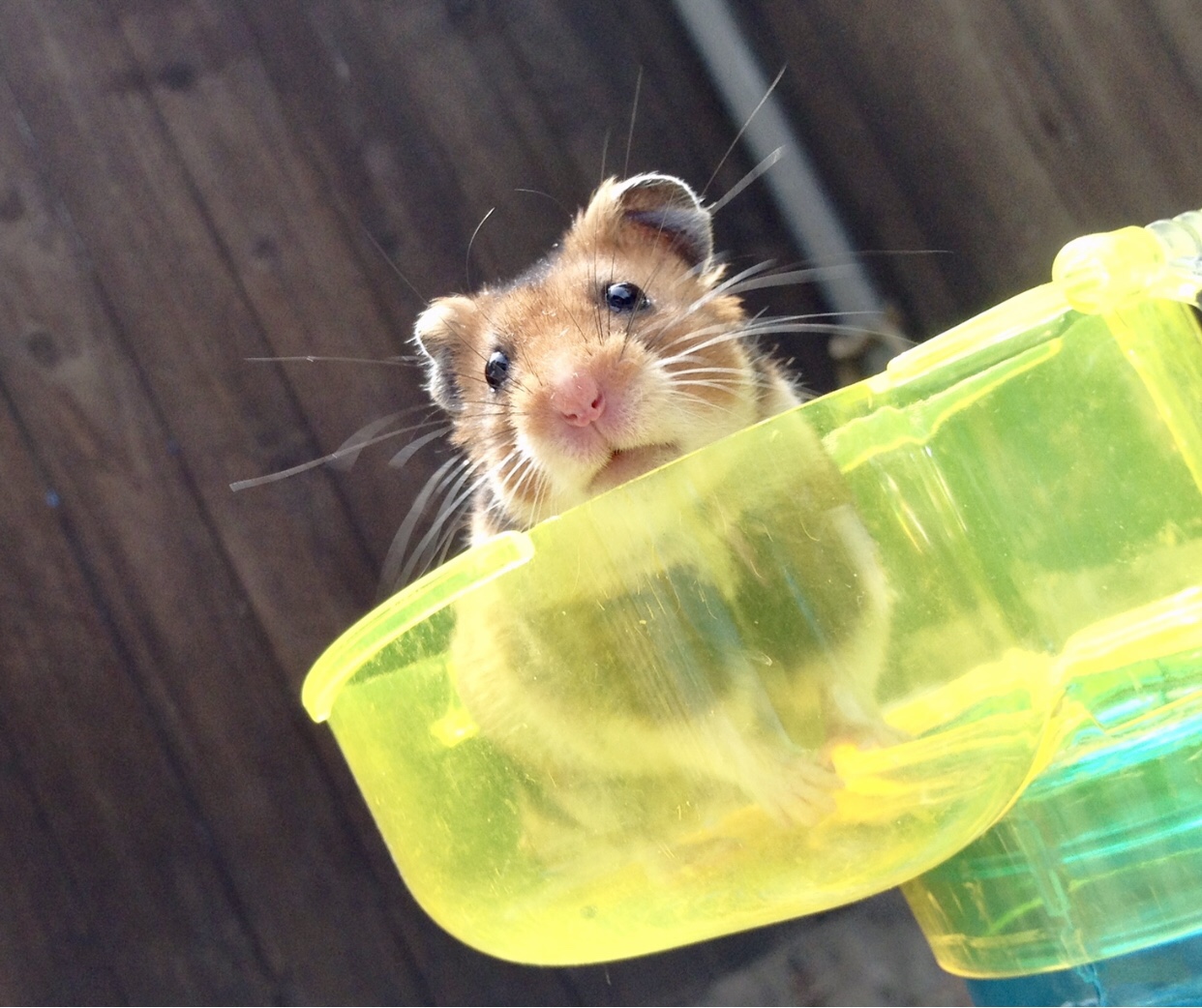 Don’t you have a harness & lease so you take this little guy for a walk? ☺Your little guy would really, really be so happy after the fresh air. 🐹Or if you have a breast pocket on your jacket or shirt, 🐹put him in there for a birds eye view of everything. 🐹BUT be aware if you have large birds flying around in your area. Have a great day!! 😎