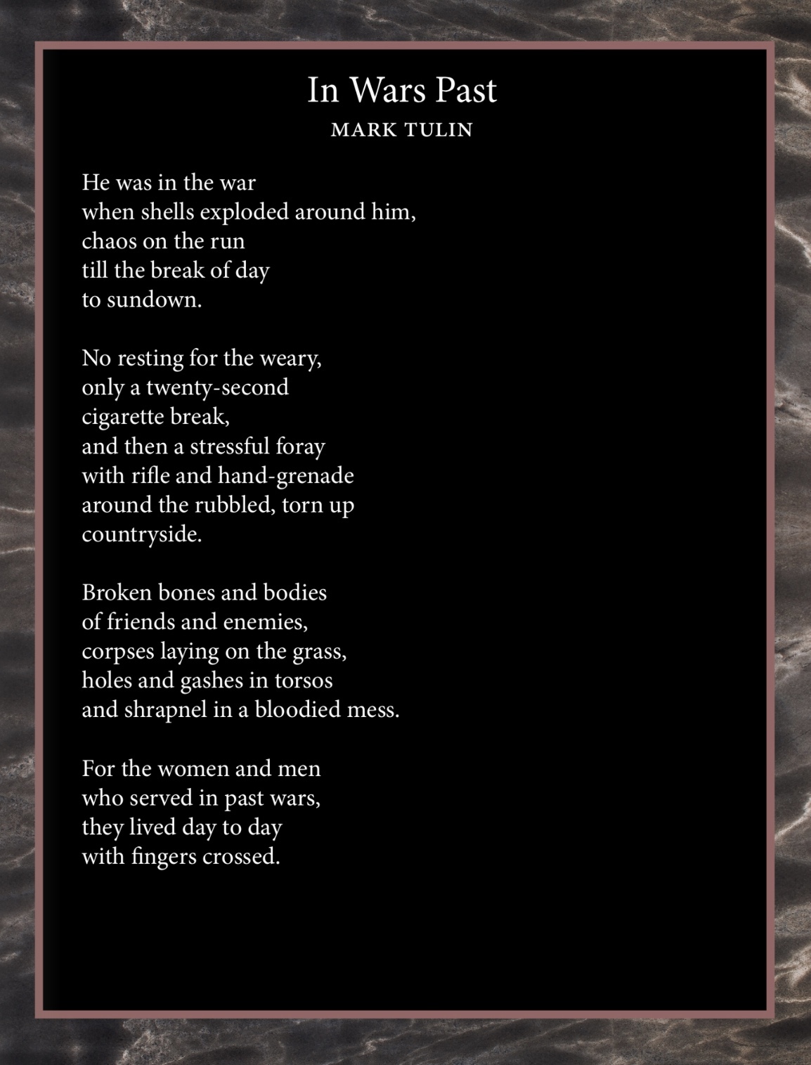 Poetry In Wars Past by Mark Tulin—Necro Magazine by Mark TulinMay 24, 2020 Comments 22 This poem was previously published in Necro Magazine, the Death Issue. Share this: Click to share on Facebook (Opens in new window) Facebook Click to share on LinkedIn (Opens in new window) LinkedIn Click to share on Pocket (Opens in new window) Pocket More Click to share on X (Opens in new window) X Click to share on Pinterest (Opens in new window) Pinterest Click to share on Reddit (Opens in new window) Reddit Click to share on Tumblr (Opens in new window) Tumblr Like Loading... 22 comments on “In Wars Past by Mark Tulin—Necro Magazine” GP Cox May 24, 2020 Reply Mark Tulin May 24, 2020 🇺🇸🇺🇸🇺🇸 Reply simplywendi May 24, 2020 may the hell they endured never be forgotten! Reply Mark Tulin May 24, 2020 Well said!! Reply simplywendi May 24, 2020 thank you………..I worked on a psych unit at a VA hospital……..my heart is forever changed. Mark Tulin May 24, 2020 I’m sure you witnessed a ton of grief and courage. simplywendi May 25, 2020 yes……….we are so blessed to have heroes live among us. Mark Tulin May 25, 2020 I second that, Wendi simplywendi May 25, 2020 🙂 Liz Gauffreau May 25, 2020 We need to remember this every day of the year. Reply simplywendi May 25, 2020 Amen! Irene May 25, 2020 AMEN! For those who have served and those still defending our country! Reply Mark Tulin May 25, 2020 🙂 Reply joyroses13 May 25, 2020 A moving poem! Reply Mark Tulin May 25, 2020 thanks Joy!! Reply joyroses13 May 25, 2020 You are very welcome! 🙂 odylicious (Val) May 25, 2020 A rousing tribute! Reply Mark Tulin May 25, 2020 Thanks! Reply Liz Gauffreau May 25, 2020 Thank you for posting this memorial to all who suffered and died in war. Reply Mark Tulin May 25, 2020 You’re welcome, Liz. I’ve never served, but I counseled several men who served in Vietnam and heard their stories. Reply Theresa June 9, 2020 I wish I had read this sooner. So hauntingly beautiful. A perfect tribute to those who served. Reply Mark Tulin June 9, 2020 Better late than never. 🙂 Reply Leave a comment Cancel reply Δ Post navigation Previous Post Next Post