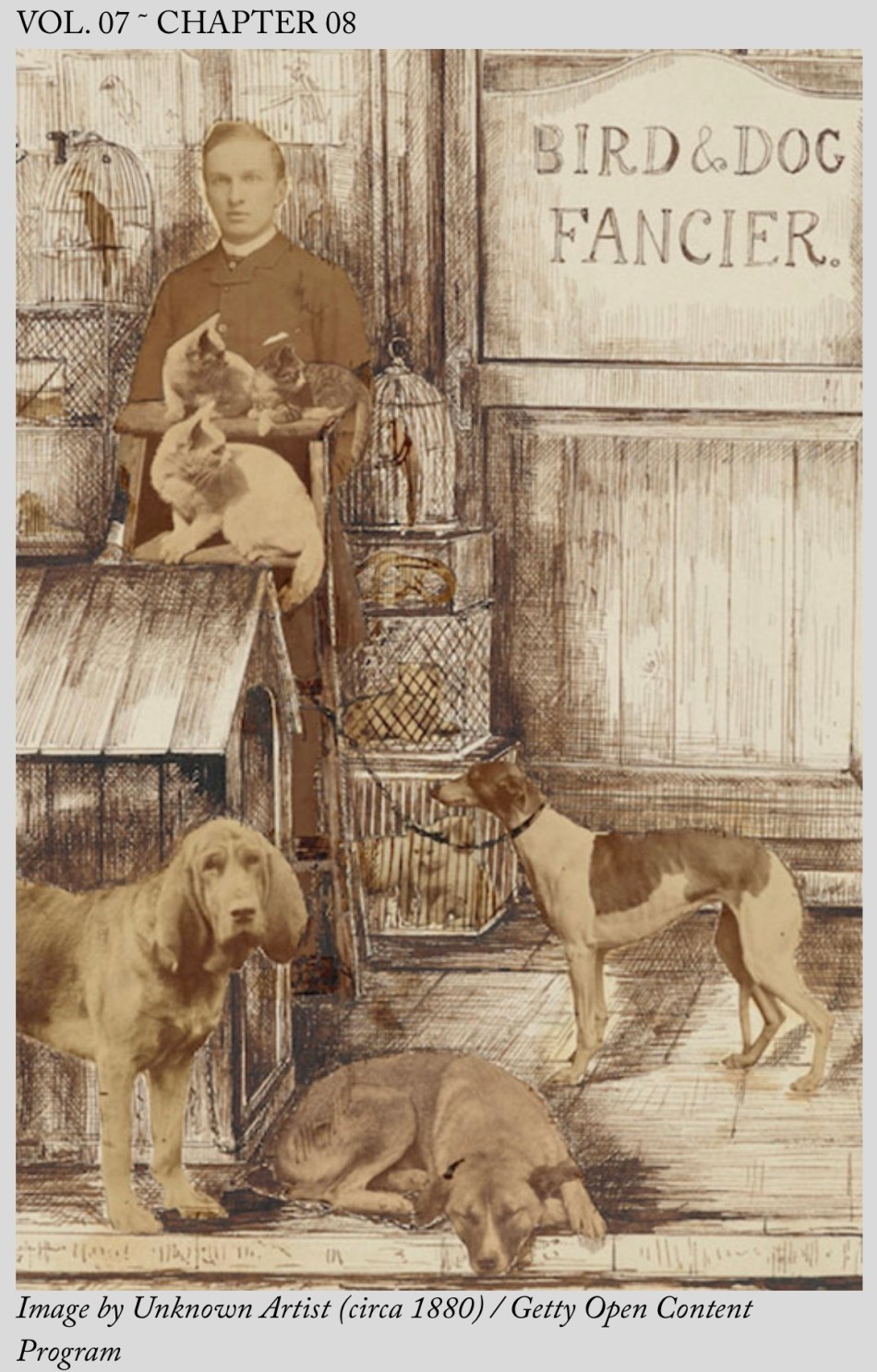 “See that hound; he was a very depressed bookkeeper. Numbers made him so sad that he overindulged in whiskey. And that white cat with the red color. She used to be a very anxious woman who was afraid to leave the house, hid in her bedroom most of the day, and only came downstairs at night for food."