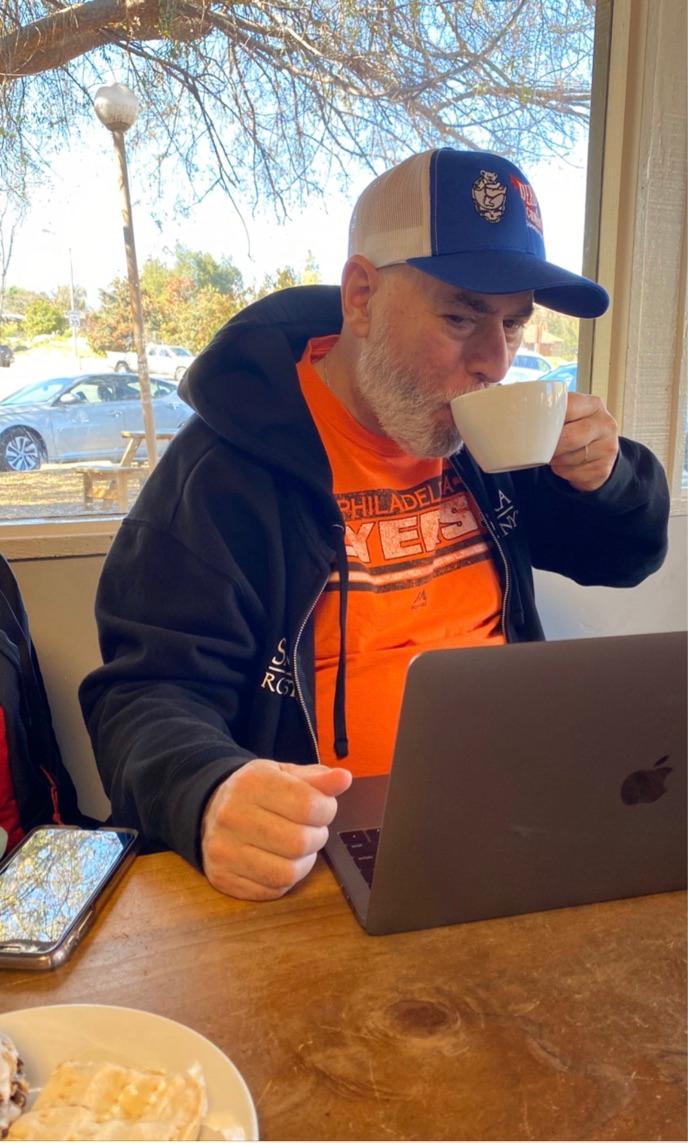 How many drafts of this poem did you write before going to the final? (And can you share a photograph of your rough drafts with pen markings on it?). I usually go through at least ten drafts of a poem over months and years in many cases. When I called the poem “Ancient Pyramid,” did the poem truly come together. Stanley had a way of stacking the potato bags. He’d place the five and ten-pound bags of potatoes on a wooden pallet and line them up so they would eventually form a pyramid about six feet high. (Left: Mark Tulin’s writing space at the local cafe)