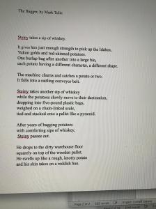 Were there any lines in any of your rough drafts of this poem that were not in the final version? And can you share them with us? I changed one line in particular, “Stanley takes a sip of whiskey.” I changed this to “Stanley takes three swigs from the whiskey bottle.” I felt that Stanley should be characterized as a more aggressive drinker than just taking a sip now and then. His hard life is reflected in the way in which he drank alcohol.