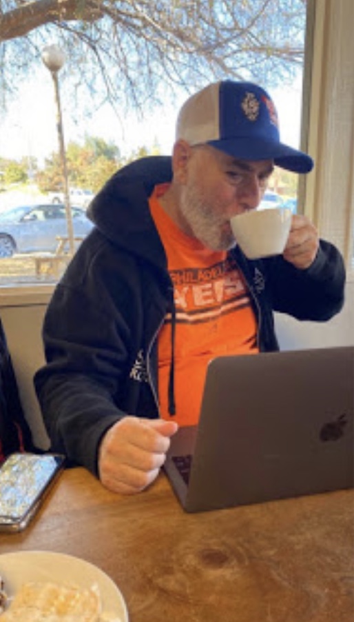How many drafts of this poem did you write before going to the final? (And can you share a photograph of your rough drafts with pen markings on it?). I usually go through at least ten drafts of a poem over months and years in many cases. When I called the poem “Ancient Pyramid,” did the poem truly come together. Stanley had a way of stacking the potato bags. He’d place the five and ten-pound bags of potatoes on a wooden pallet and line them up so they would eventually form a pyramid about six feet high. (Left: Mark Tulin’s writing space at the local cafe)