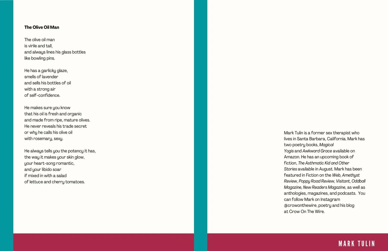 Poetry Issue 1 – Throats to the Sky/ Olive Oil Man, By Mark Tulin by Mark TulinSeptember 14, 2020 Comments 5 Check out this new erotic poetry and art online magazine. The poem “The Olive Oil Man” by Mark Tulin TTTS Mag Issue 1 – Throats to the Sky— Read on www.throatstothesky.com/themagazine/ttts-mag-issue-1/ Share this: Click to share on Facebook (Opens in new window) Facebook Click to share on LinkedIn (Opens in new window) LinkedIn Click to share on Pocket (Opens in new window) Pocket More Click to share on X (Opens in new window) X Click to share on Pinterest (Opens in new window) Pinterest Click to share on Reddit (Opens in new window) Reddit Click to share on Tumblr (Opens in new window) Tumblr Like Loading... 5 comments on “Issue 1 – Throats to the Sky/ Olive Oil Man, By Mark Tulin” luisa zambrotta September 14, 2020 I’ve just read it: gorgeous! Reply Mark Tulin September 14, 2020 Thanks, Luisa Reply luisa zambrotta September 14, 2020 ❤️❤️❤️ Hope September 15, 2020 WOW! Great writing! 🖋📓 Reply Mark Tulin September 15, 2020 Thanks!! Reply Leave a comment Cancel reply Δ Post navigation Previous Post Next Post
