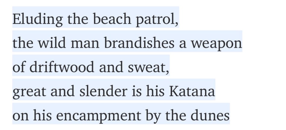 Poetry Ninja Hero, by Mark Tulin/Scrittura by Mark TulinApril 5, 2021 Comments 8 link.medium.com/fNUGhvtkdfb For the complete poem, please click the link. A related poem: Over-Stuffed Cart, by Mark Tulin Share this: Click to share on Facebook (Opens in new window) Facebook Click to share on LinkedIn (Opens in new window) LinkedIn Click to share on Pocket (Opens in new window) Pocket More Click to share on X (Opens in new window) X Click to share on Pinterest (Opens in new window) Pinterest Click to share on Reddit (Opens in new window) Reddit Click to share on Tumblr (Opens in new window) Tumblr Like Loading... 8 comments on “Ninja Hero, by Mark Tulin/Scrittura” Jonathan Caswell April 6, 2021 Reblogged this on By the Mighty Mumford and commented: YOWZA, YOWZA-! Reply Mark Tulin April 6, 2021 👍👍 Reply Jonathan Caswell April 6, 2021 ORT-ORT-ORT-! Mark Tulin April 6, 2021 😀 Kally April 11, 2021 Awesome post! Love this. Reply Mark Tulin April 11, 2021 Thanks Kally. Reply Theresa April 13, 2021 Again, beautiful and visual. Amazing the pictures you “paint” with your words. Reply Mark Tulin April 13, 2021 Thanks, Theresa. Reply Leave a comment Cancel reply Δ Post navigation Previous Post Next Post