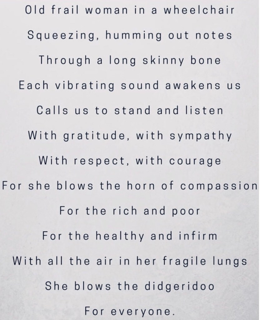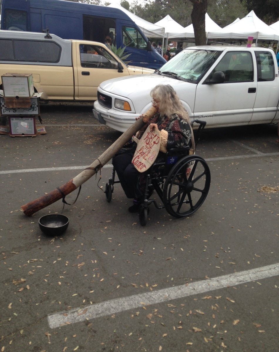 I renamed this poem “Ode to the Musician at the Farmer’s Market” because I wanted to pay tribute to this special person and wonderful didjeridoo player who often plays at the Santa Barbara Farmer’s Market. I think she had cancer, but not certain. If she is still there, please support her with whatever you can spare. This poem was previously on this site as well as Instagram (@crowonthewire_poetry).