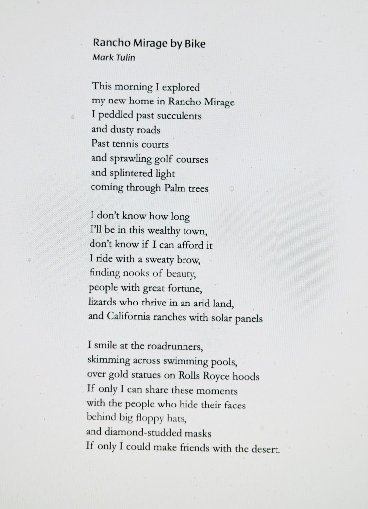 The Last Leaves Issue #3 features three of my poems, pages 44 to 46, including the following poem, Rancho Mirage by Bike.