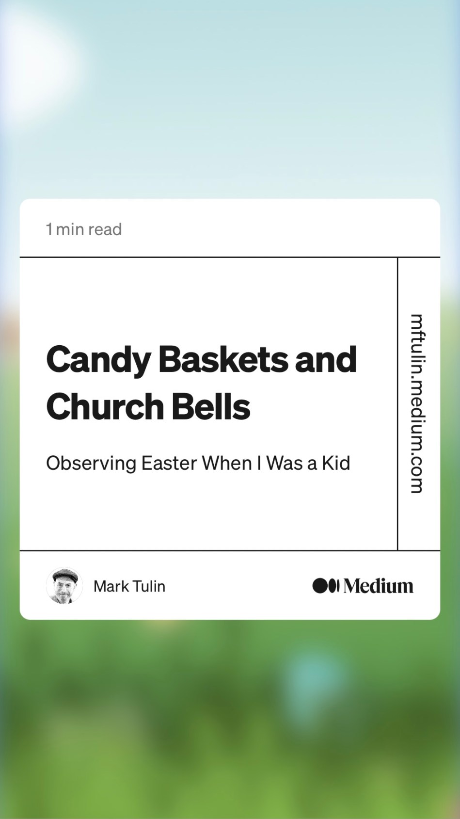 Poetry Candy Baskets and Church Bells by Mark Tulin/Blue Insights by Mark TulinApril 17, 2022 Comment 1 link.medium.com/dLlAW8aEjpb Share this: Click to share on Facebook (Opens in new window) Facebook Click to share on LinkedIn (Opens in new window) LinkedIn Click to share on Pocket (Opens in new window) Pocket More Click to share on X (Opens in new window) X Click to share on Pinterest (Opens in new window) Pinterest Click to share on Reddit (Opens in new window) Reddit Click to share on Tumblr (Opens in new window) Tumblr Like Loading... 1 comment on “Candy Baskets and Church Bells by Mark Tulin/Blue Insights” thereluctantpoet April 18, 2022 Reblogged this on The Reluctant Poet. Reply Leave a comment Cancel reply Δ Post navigation Previous Post Next Post