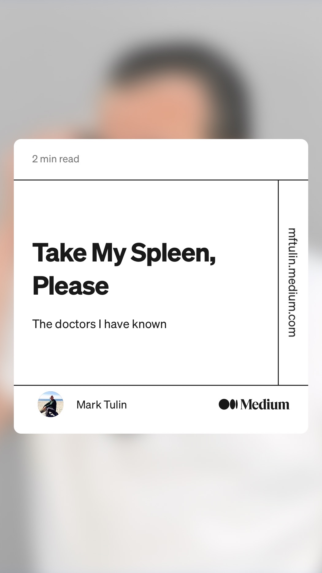 Humor Poetry Humor: Take My Spleen, Please, by Mark Tulin/MuddyUm by Mark TulinMarch 30, 2023 Comments 0 link.medium.com/Xtw1w7QNAyb Celebrating National Doctors Day with satire. Take My Spleen, Please. Share this: Click to share on Facebook (Opens in new window) Facebook Click to share on LinkedIn (Opens in new window) LinkedIn Click to share on Pocket (Opens in new window) Pocket More Click to share on X (Opens in new window) X Click to share on Pinterest (Opens in new window) Pinterest Click to share on Reddit (Opens in new window) Reddit Click to share on Tumblr (Opens in new window) Tumblr Like Loading... 0 comments on “Humor: Take My Spleen, Please, by Mark Tulin/MuddyUm” Leave a comment Cancel reply Δ Post navigation Previous Post Next Post