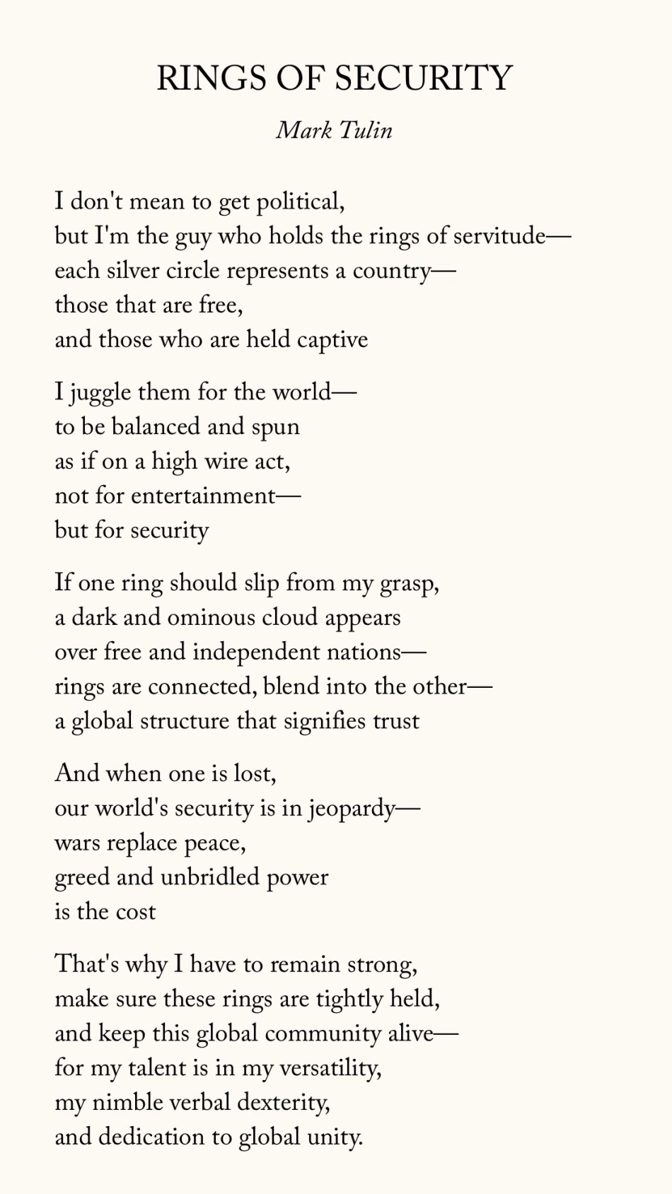 Poetry Rings of Security by Mark Tulin- Visual Verse by Mark TulinFebruary 25, 2024 Comments 3 Rings of Security – Visual Verse Share this: Click to share on Facebook (Opens in new window) Facebook Click to share on LinkedIn (Opens in new window) LinkedIn Click to share on Pocket (Opens in new window) Pocket More Click to share on X (Opens in new window) X Click to share on Pinterest (Opens in new window) Pinterest Click to share on Reddit (Opens in new window) Reddit Click to share on Tumblr (Opens in new window) Tumblr Like Loading... 3 comments on “Rings of Security by Mark Tulin- Visual Verse” Liz Gauffreau May 3, 2022 It sure would be nice if Cirque du Soleil could save us. Reply Mark Tulin May 3, 2022 Good one, Liz!! 👍 Reply Liz Gauffreau May 3, 2022 Thanks, Mark! Leave a comment Cancel reply Δ Post navigation Previous Post Next Post