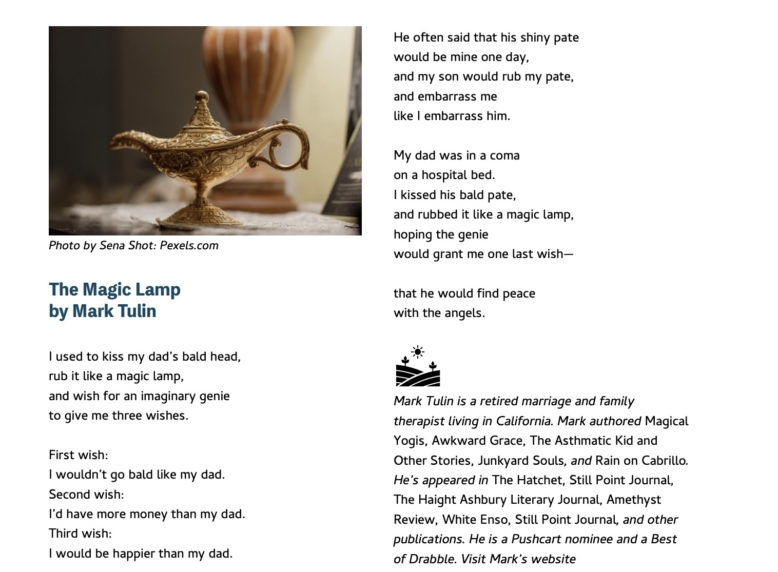 Poetry New Anthology: Soul Poetry V1, Issue 2 by Mark TulinJune 12, 2025 Comments 5 Many thanks to Soul Poetry and Arvilla Fee for including my poem, “The Magic Lamp.” Click the link to read the issue: Soul Poetry Share this: Click to share on Facebook (Opens in new window) Facebook Click to share on LinkedIn (Opens in new window) LinkedIn Click to share on Pocket (Opens in new window) Pocket More Click to share on X (Opens in new window) X Click to share on Pinterest (Opens in new window) Pinterest Click to share on Reddit (Opens in new window) Reddit Click to share on Tumblr (Opens in new window) Tumblr Like Loading... 5 comments on “New Anthology: Soul Poetry V1, Issue 2” Kate@athousandbitsofpaper June 12, 2025 What a beautiful poem – a very worthy inclusion Mark Reply Mark Tulin June 14, 2025 Thank you, Kate. 🙂 Reply Mark Tulin June 21, 2025 Thank you, Kate. Reply Susi Bocks June 21, 2025 First, such an emotional post, Mark, and second, congratulations! Reply Mark Tulin June 24, 2025 Your congrats are always welcome, Susi. Reply Leave a comment Cancel reply Δ Post navigation Previous Post Next Post